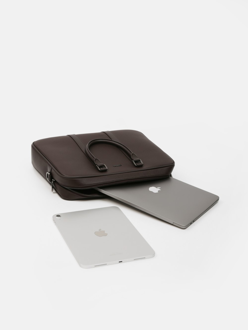 Cặp nam phom hộp tối giản, bề mặt da hạt chống xước nhẹ, điểm nhấn hai dải dọc và khoá kéo đôi kim loại trầm. Ngăn chính chứa tài liệu A4, laptop mỏng 13–14", bố trí thêm ngăn phụ cho điện thoại – bút – cáp. Đi kèm dây đeo bản rộng tháo rời và quai xách đôi, giữ phom đứng đẹp khi sử dụng. Dễ phối từ suit công sở đến smart-casual cuối tuần, giúp anh giữ vẻ gọn gàng và chuyên nghiệp suốt ngày dài.