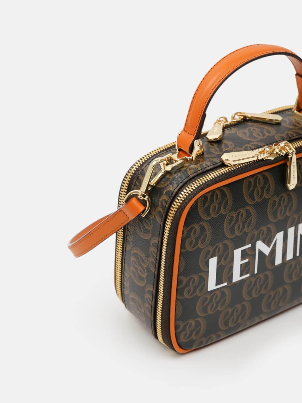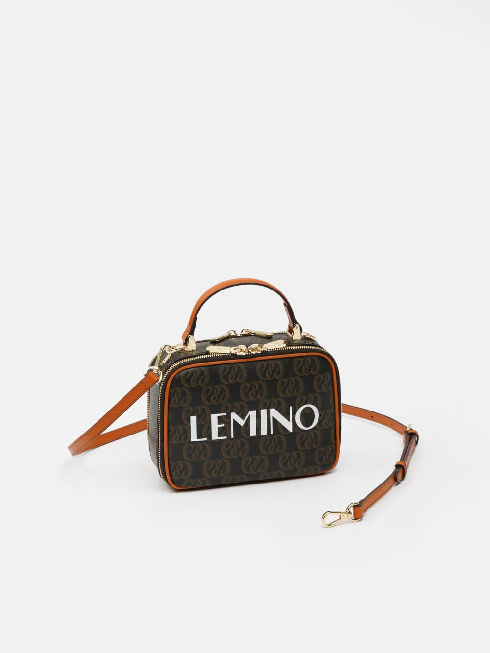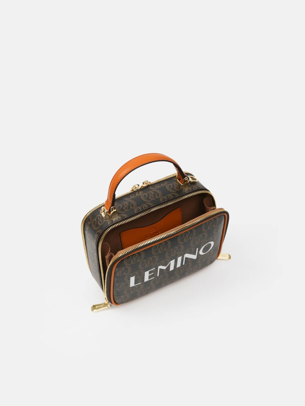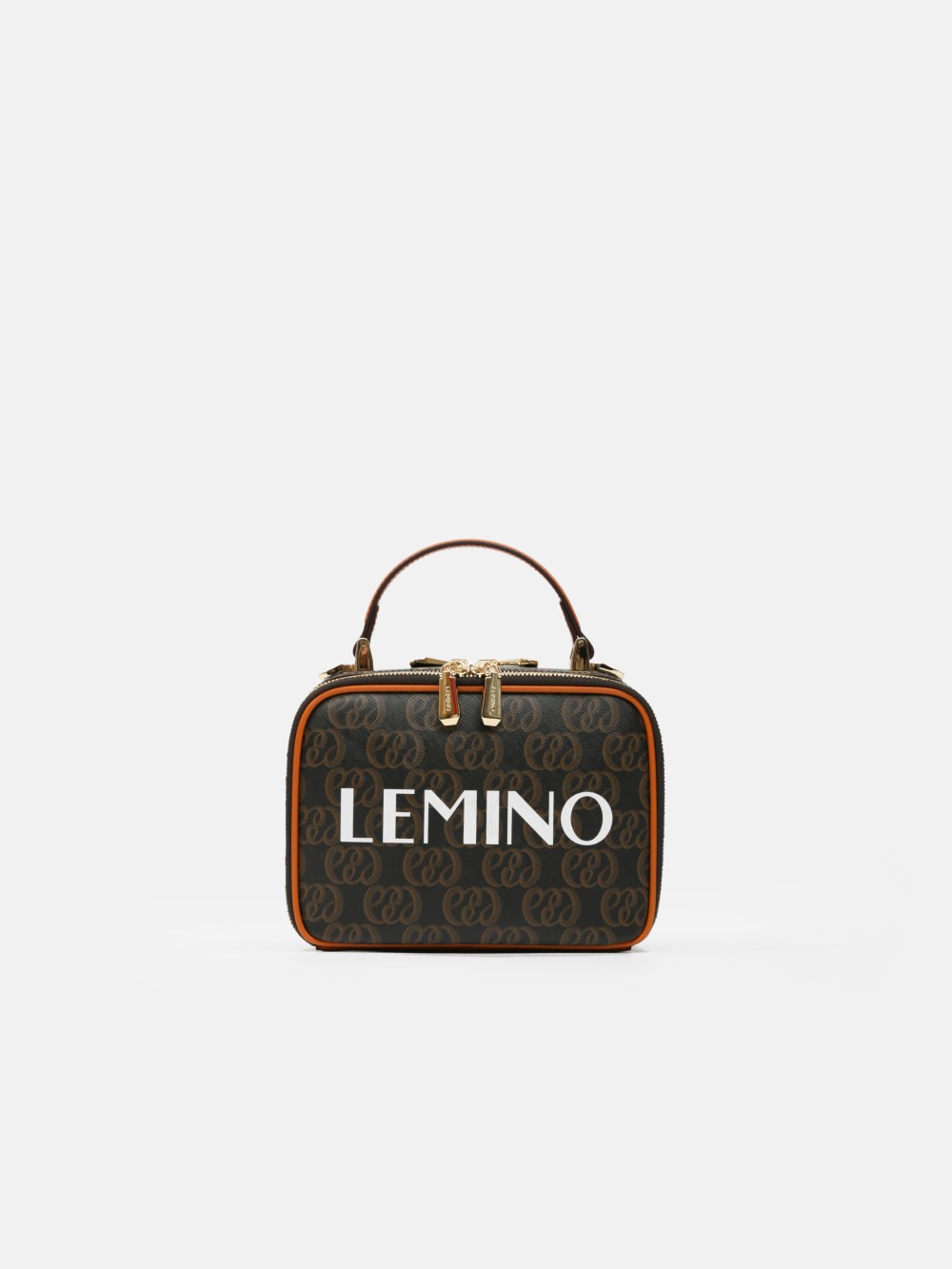 Túi box monogram LEMINO 2 ngăn – dáng vuông bo góc giữ phom, khóa kéo chạy quanh, tay xách da thanh lịch. Logo lớn nổi bật, viền da cam nâu sang nét, phù hợp đi chơi – hẹn hò – tiệc nhẹ.