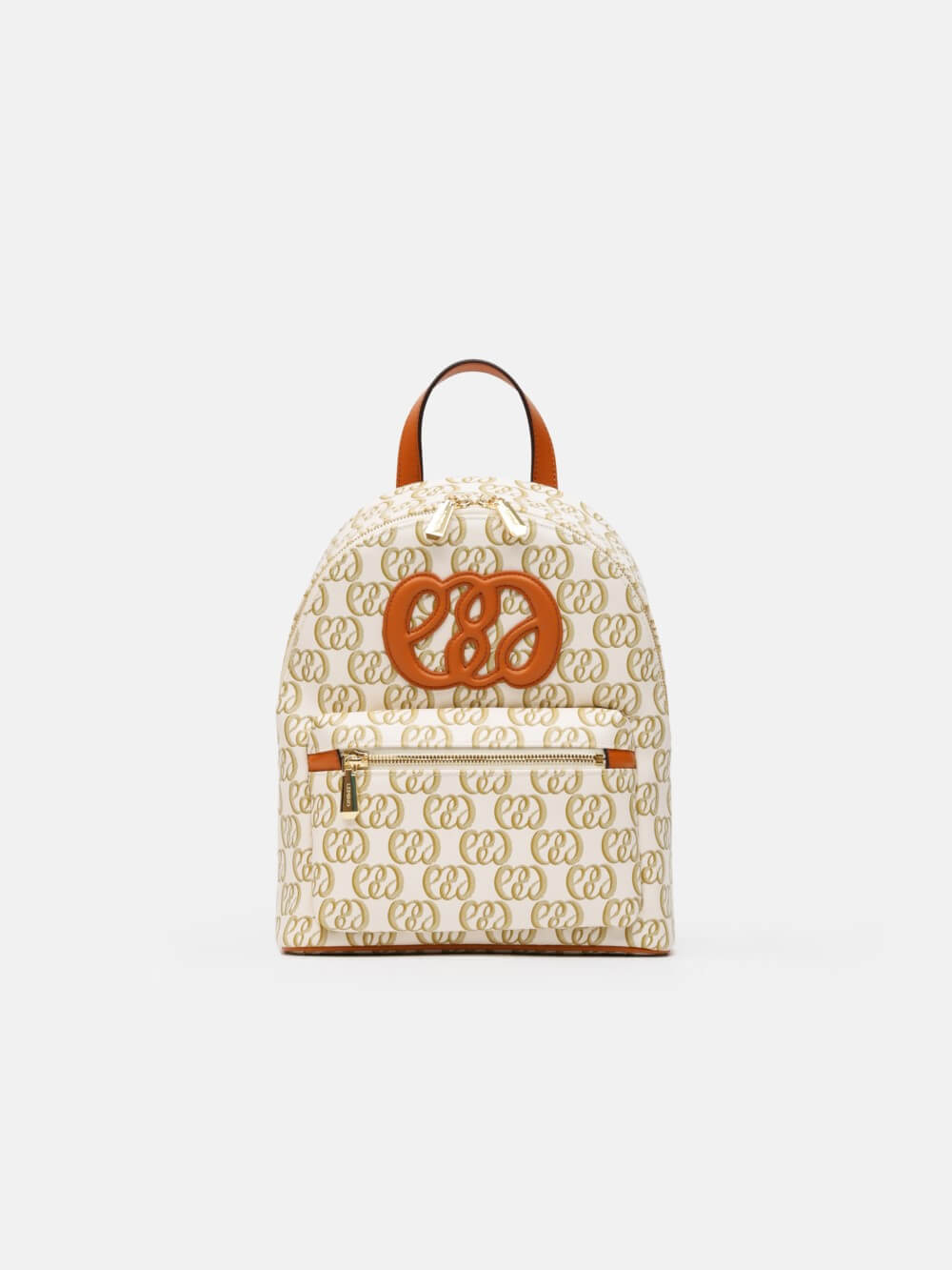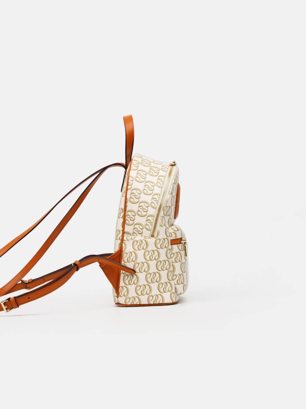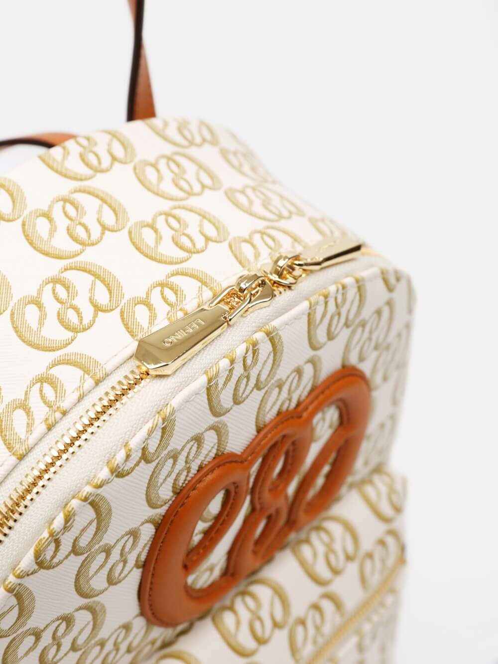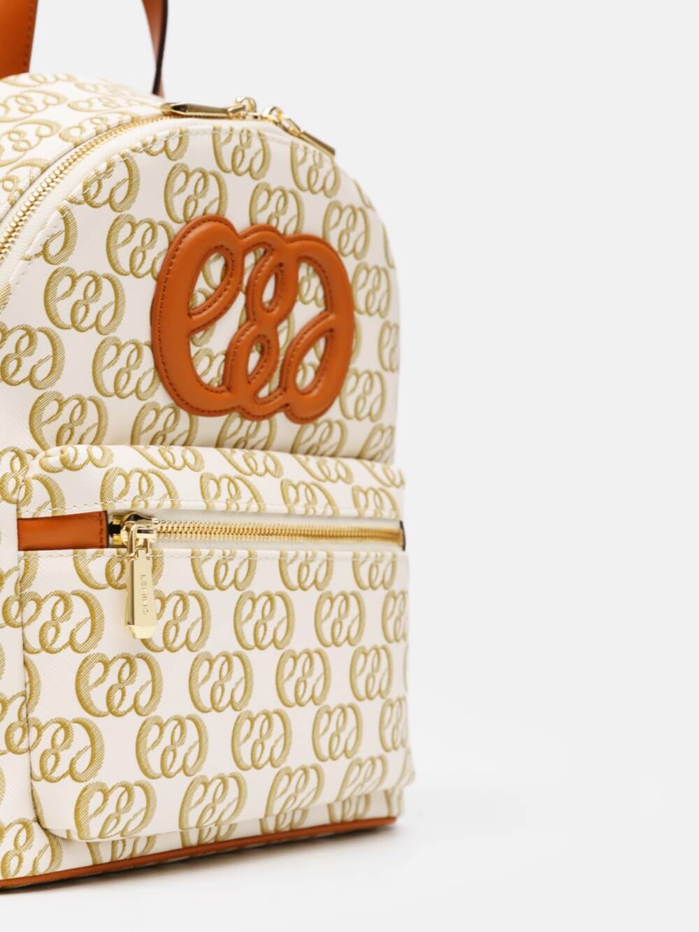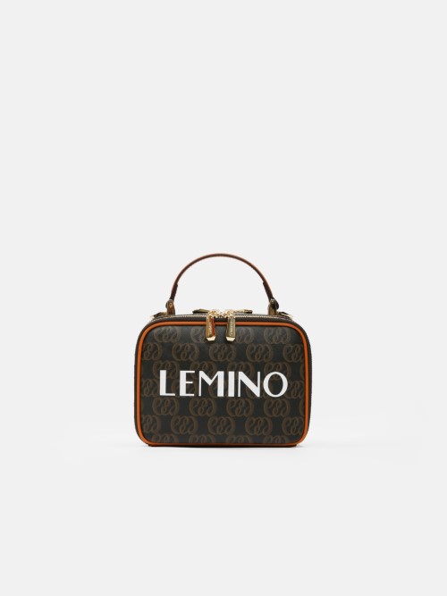 Balo mini monogram LEMINO – dáng cong gọn nhẹ, logo nổi tinh tế, phối da cam nâu sang nét. Thiết kế ngăn chính khóa kéo đôi và ngăn phụ phía trước tiện sắp xếp, phù hợp đi làm – dạo phố – du lịch.