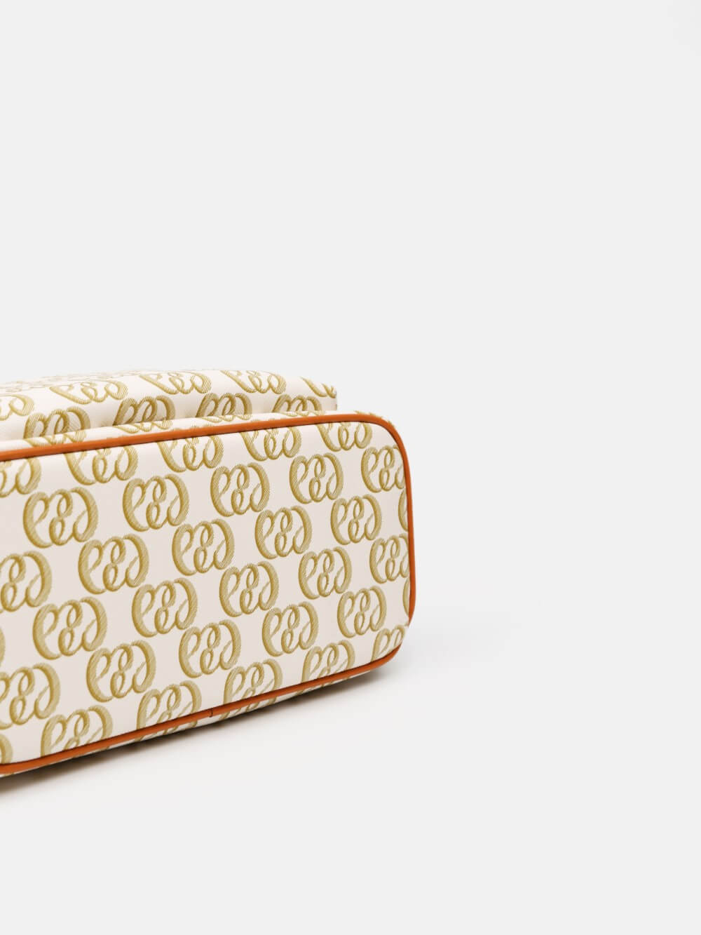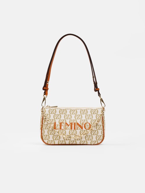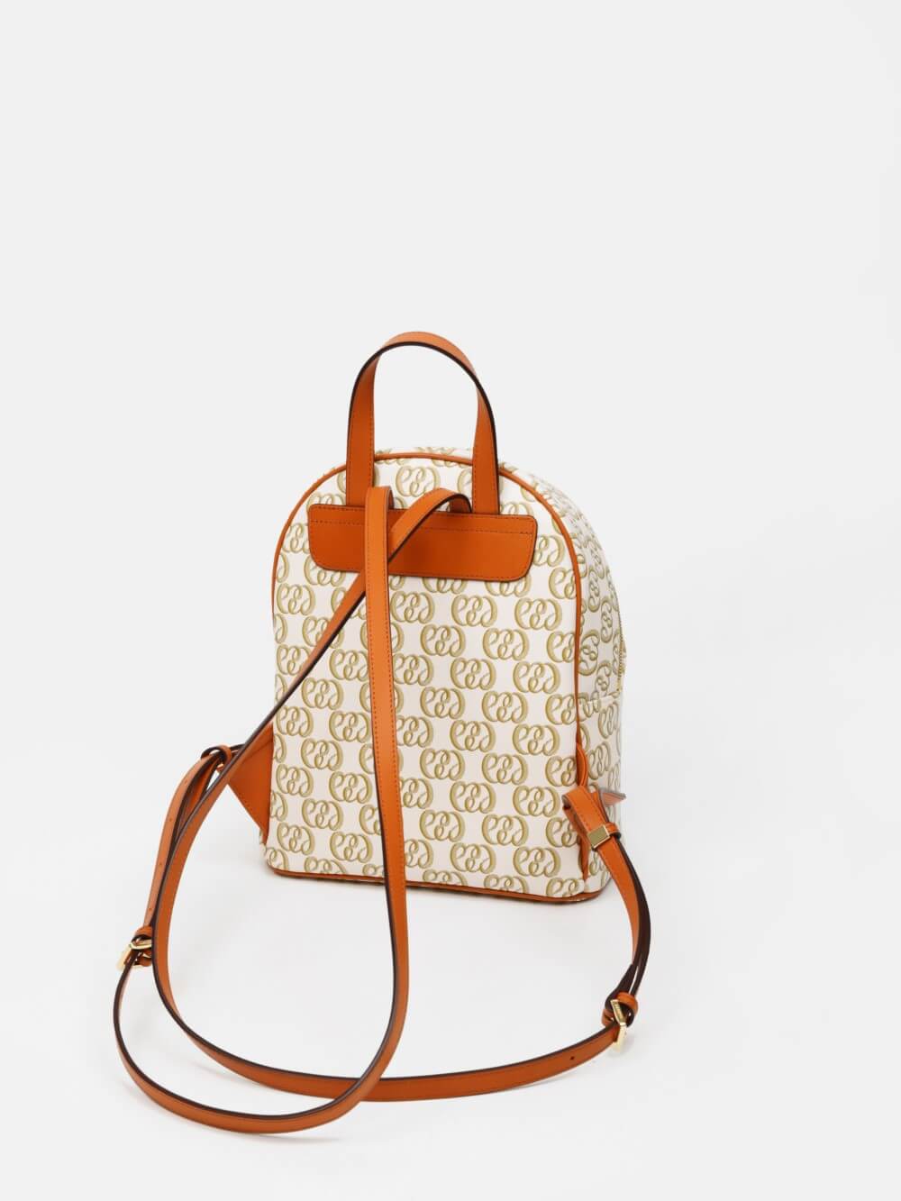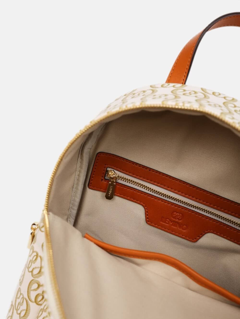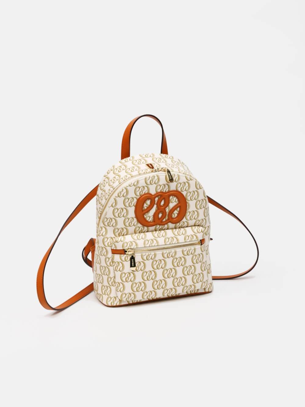 Balo mini monogram LEMINO – dáng cong gọn nhẹ, logo nổi tinh tế, phối da cam nâu sang nét. Thiết kế ngăn chính khóa kéo đôi và ngăn phụ phía trước tiện sắp xếp, phù hợp đi làm – dạo phố – du lịch.