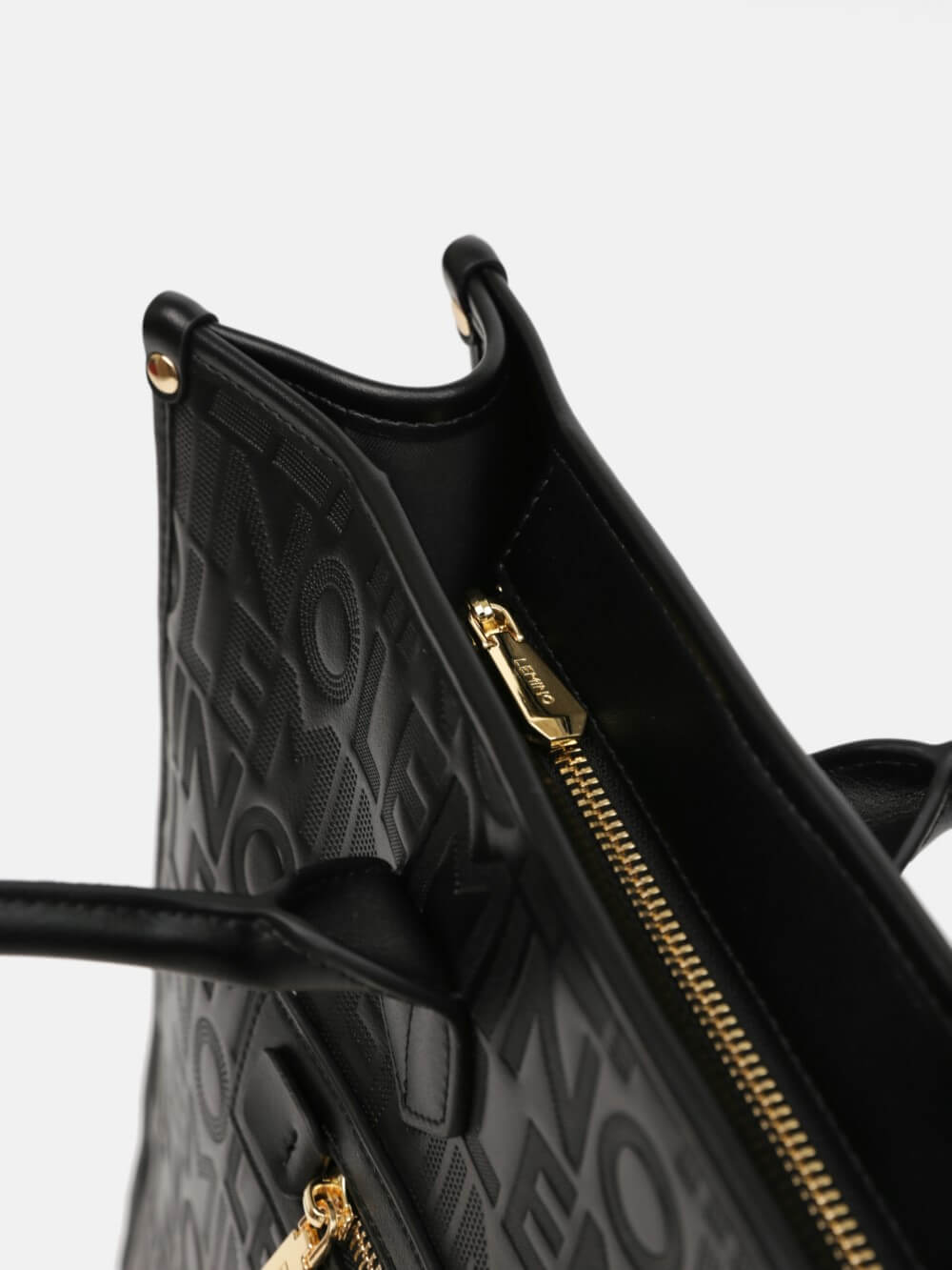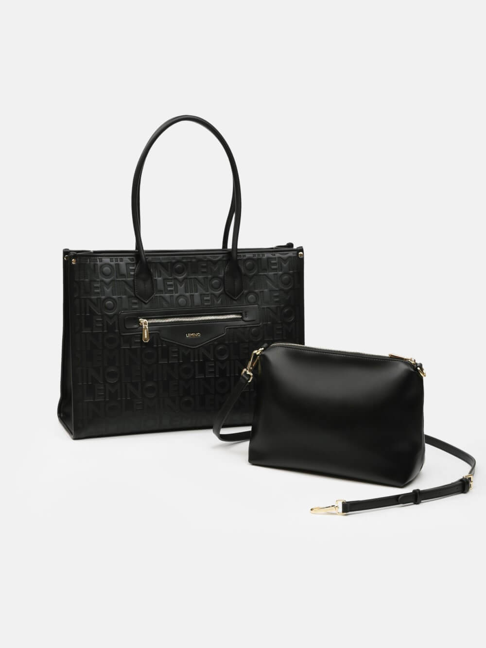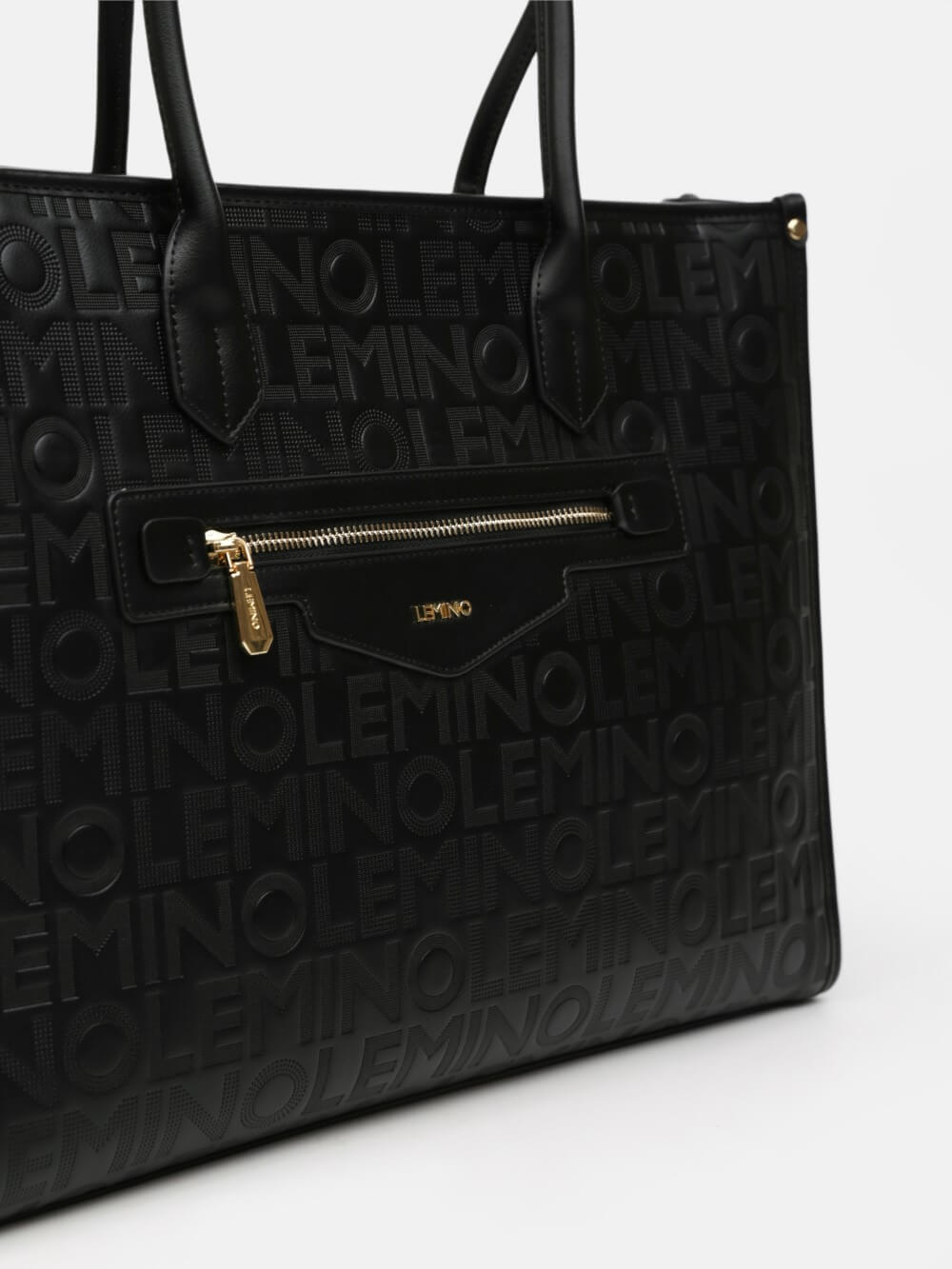 Bề mặt túi được xử lý dập monogram LEMINO toàn thân, tạo hiệu ứng sang trọng và nhận diện thương hiệu rõ nét. Điểm nhấn phía trước là ngăn khóa kéo ngang kết hợp logo kim loại tinh tế, vừa tăng tính thẩm mỹ vừa thuận tiện để cất giữ các vật dụng nhỏ.