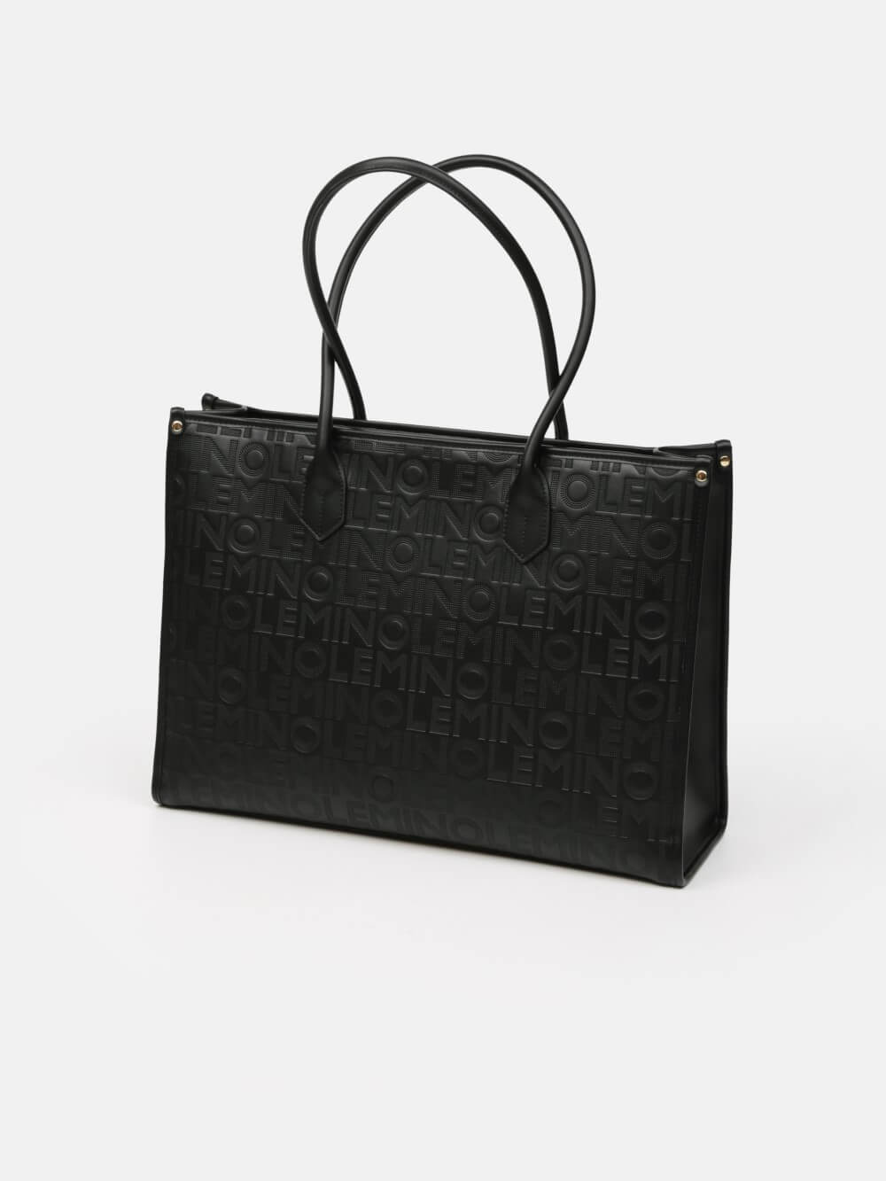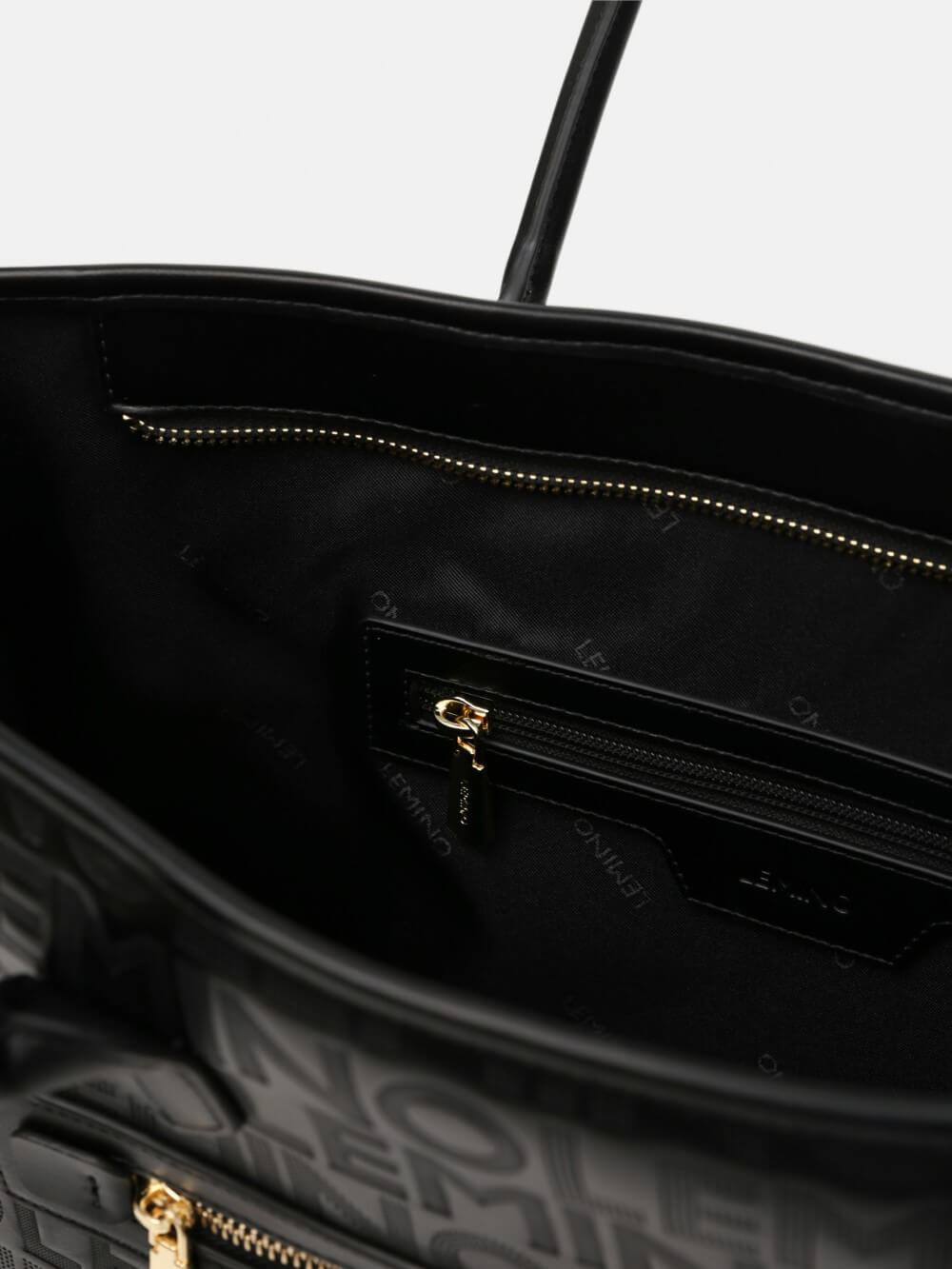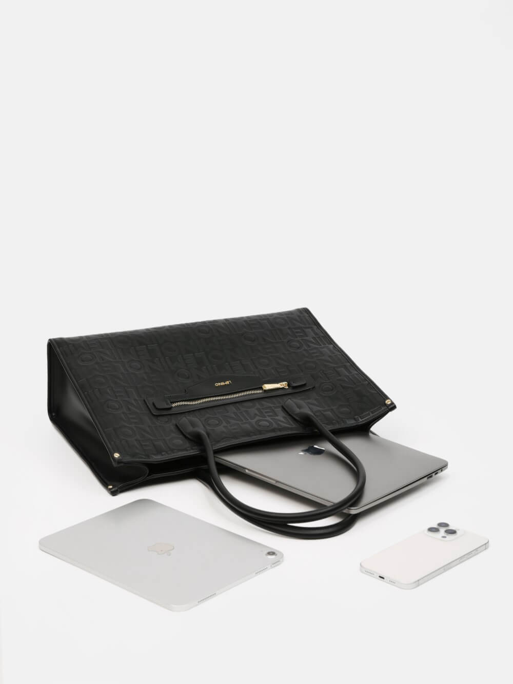 Bề mặt túi được xử lý dập monogram LEMINO toàn thân, tạo hiệu ứng sang trọng và nhận diện thương hiệu rõ nét. Điểm nhấn phía trước là ngăn khóa kéo ngang kết hợp logo kim loại tinh tế, vừa tăng tính thẩm mỹ vừa thuận tiện để cất giữ các vật dụng nhỏ.