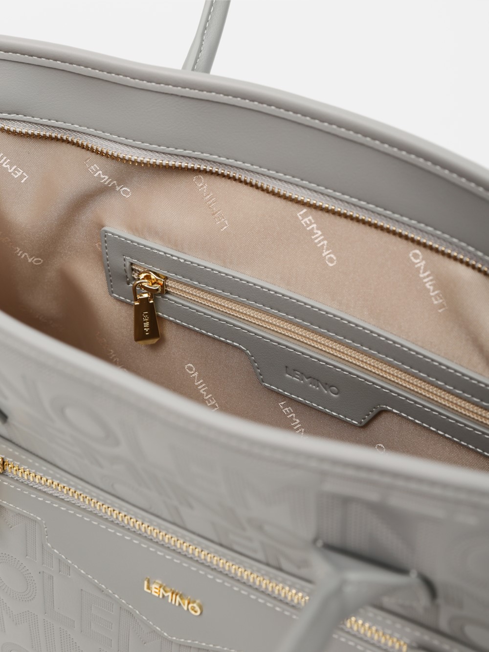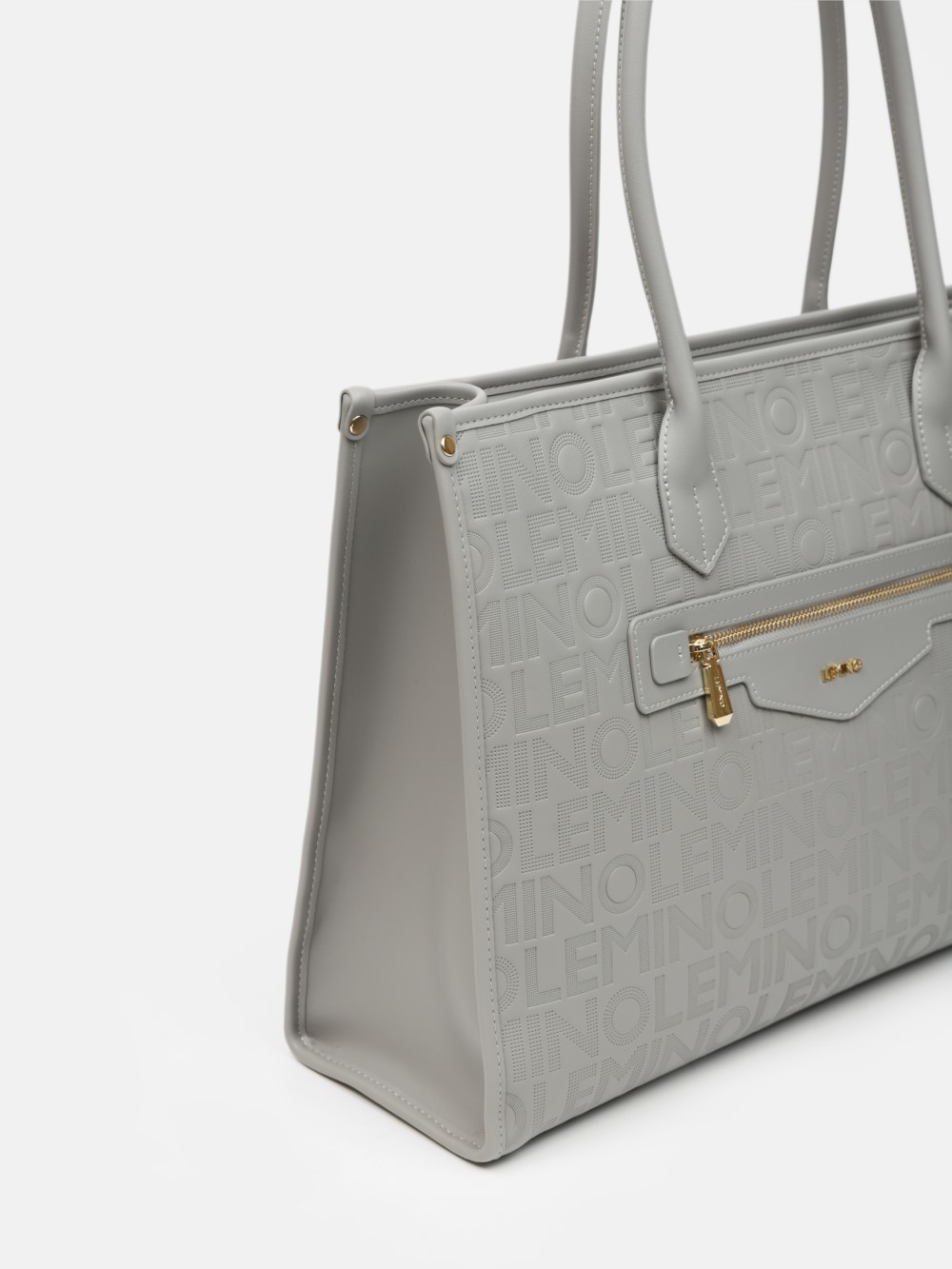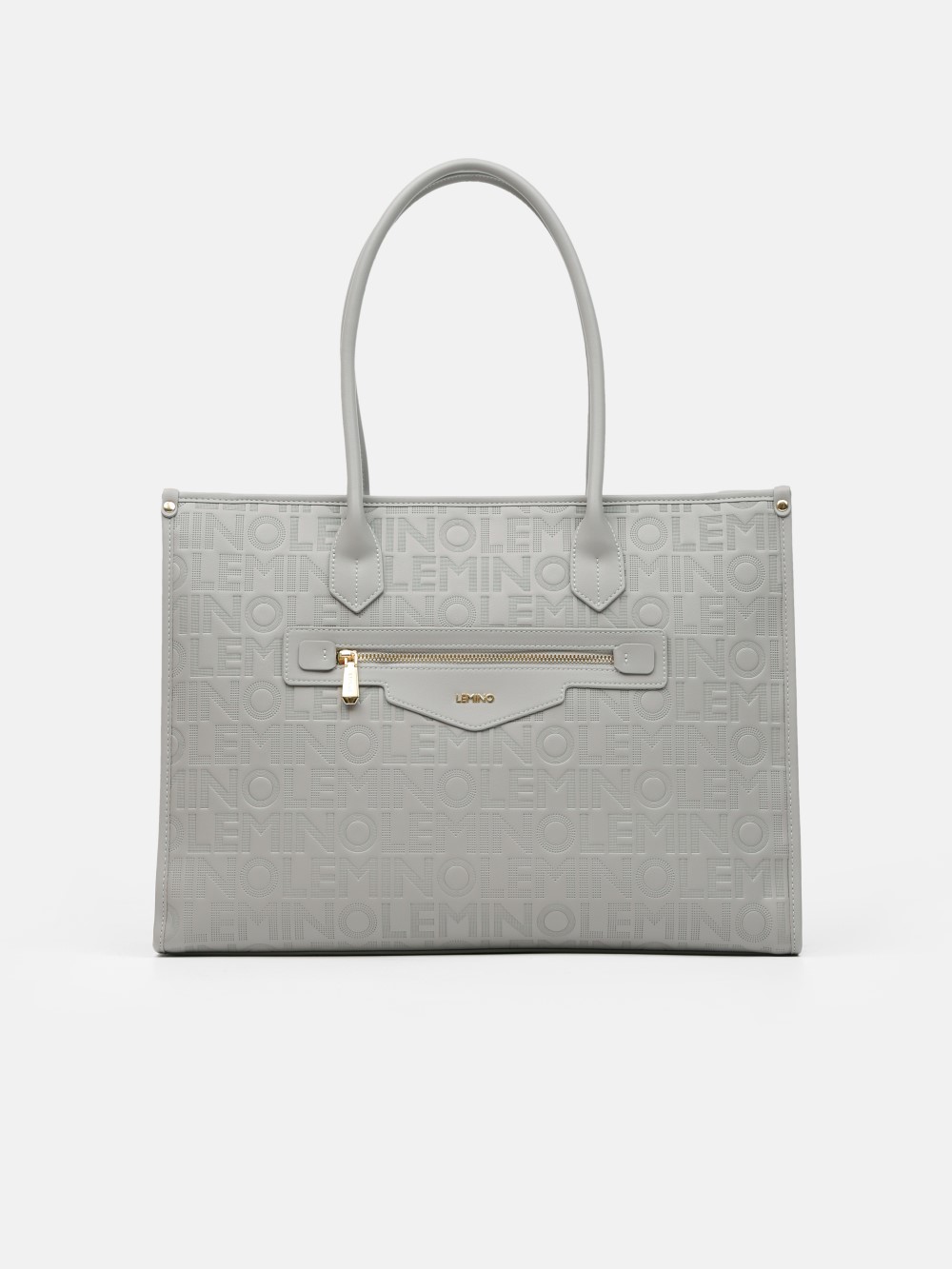 Bề mặt túi được xử lý dập monogram LEMINO toàn thân, tạo hiệu ứng sang trọng và nhận diện thương hiệu rõ nét. Điểm nhấn phía trước là ngăn khóa kéo ngang kết hợp logo kim loại tinh tế, vừa tăng tính thẩm mỹ vừa thuận tiện để cất giữ các vật dụng nhỏ.