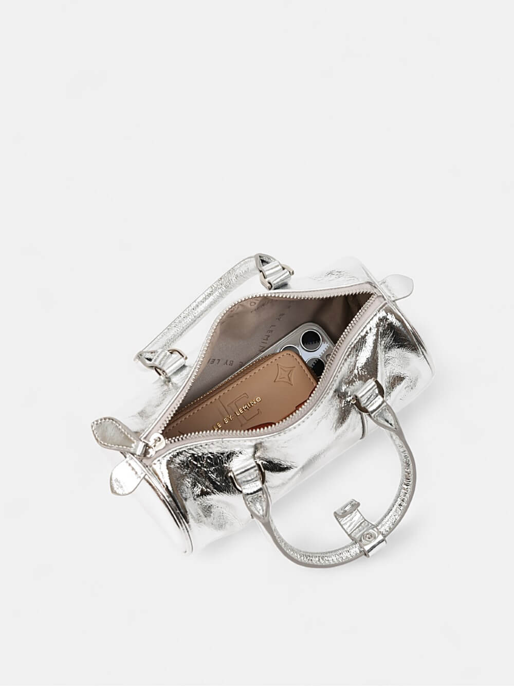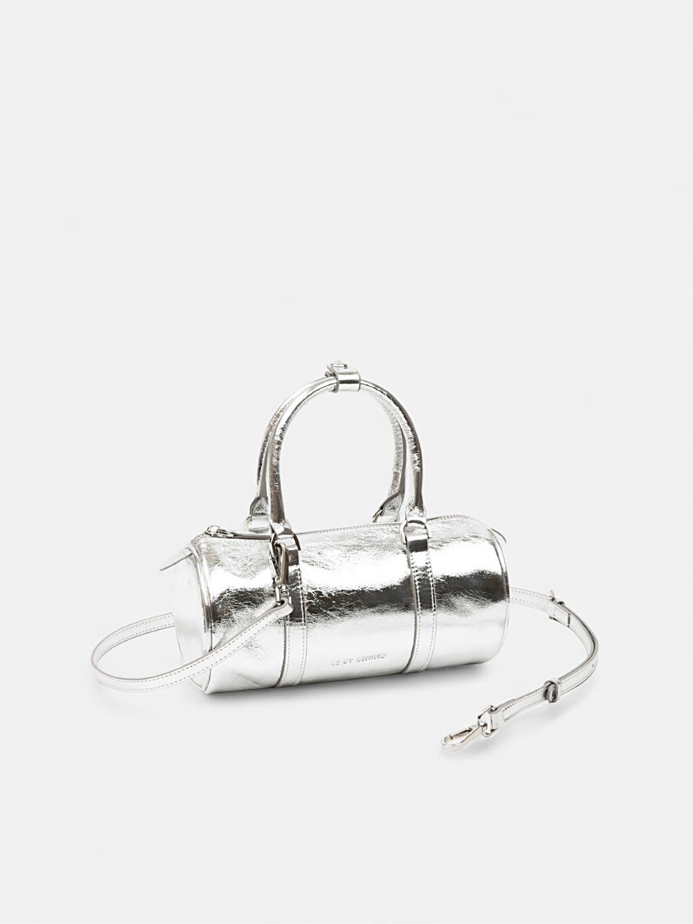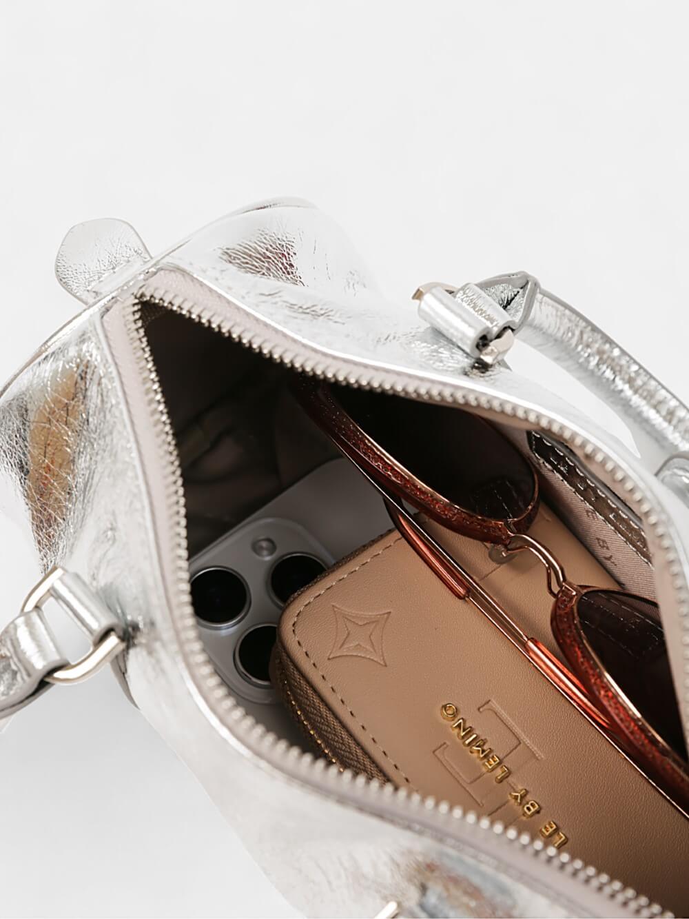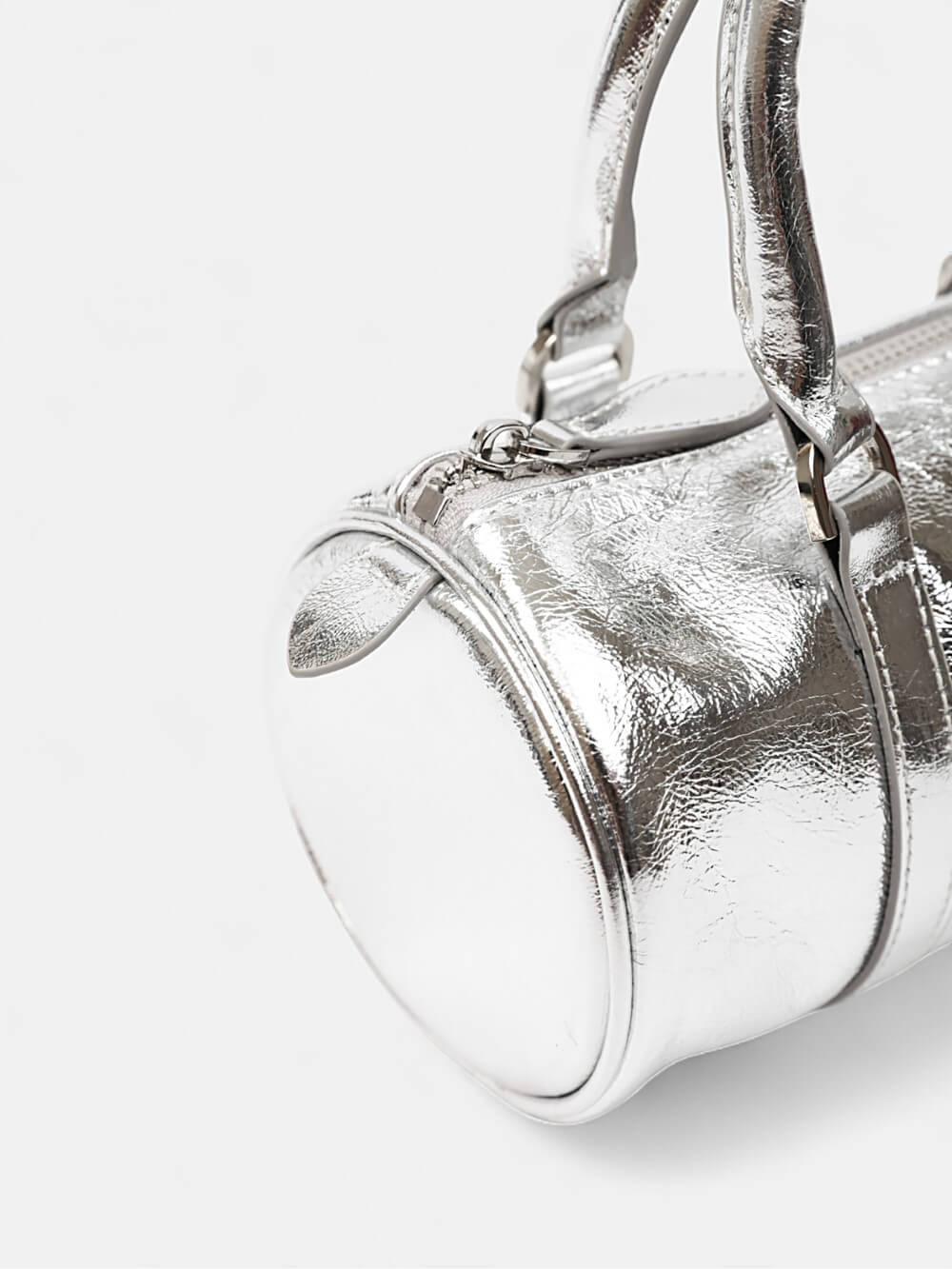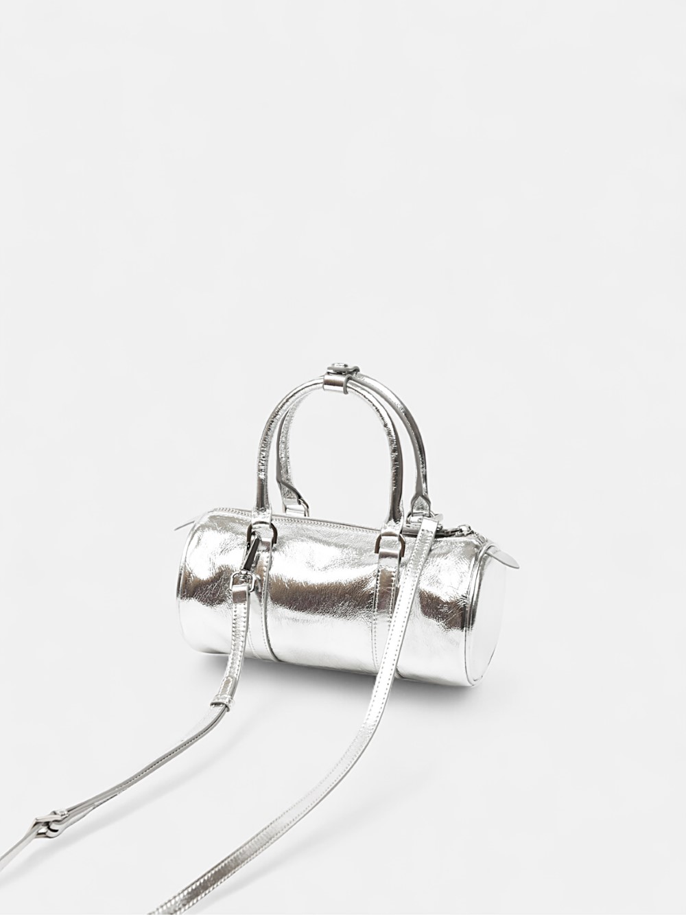 Mini barrel bag ánh kim LE BY LEMINO – phom trụ giữ dáng, khóa kéo an toàn, dây đeo tháo rời linh hoạt; nhỏ gọn nhưng đủ chỗ cho vật dụng mỗi ngày