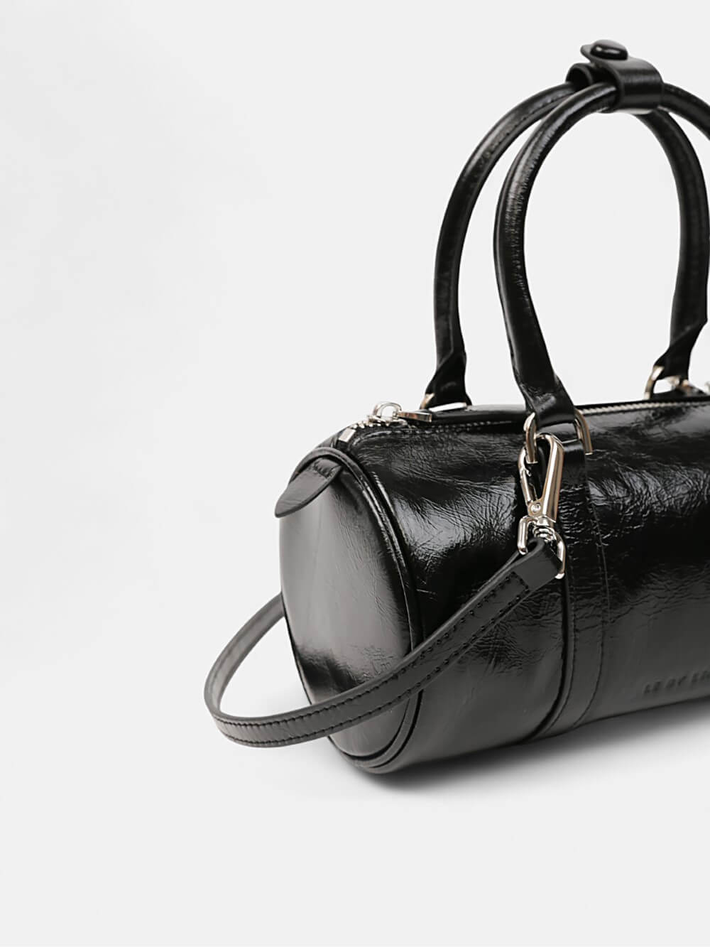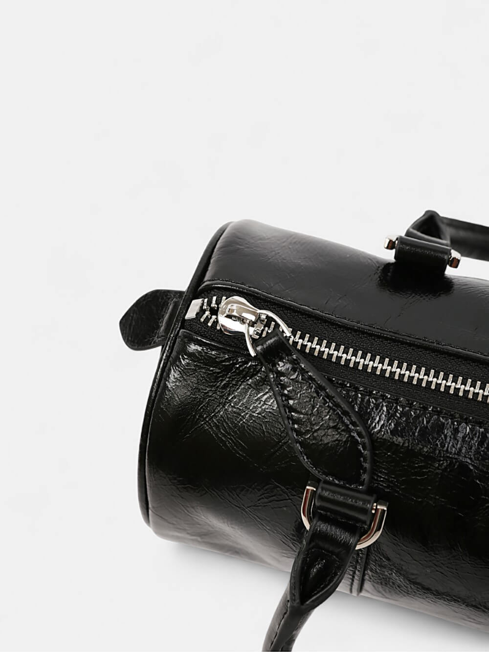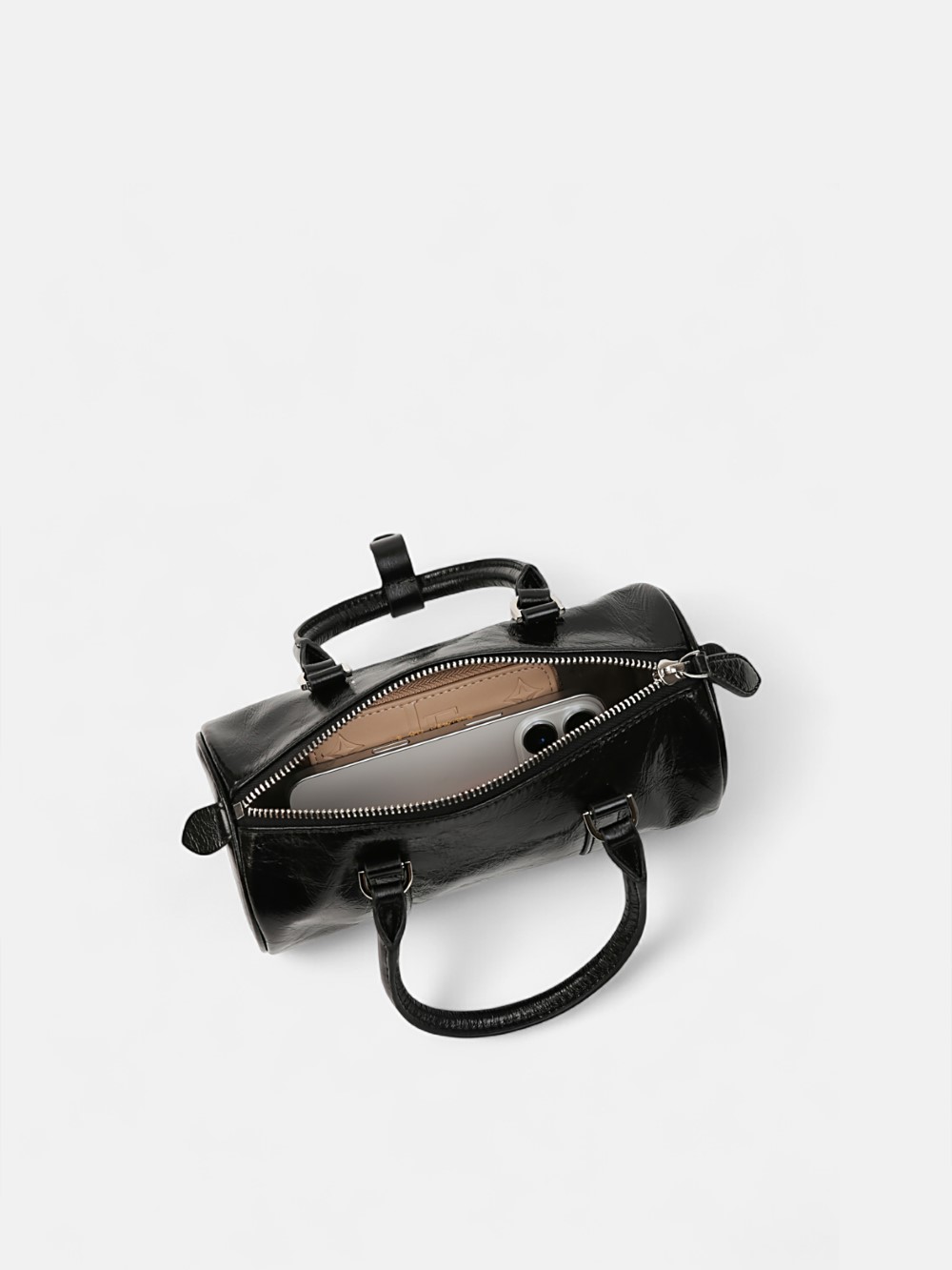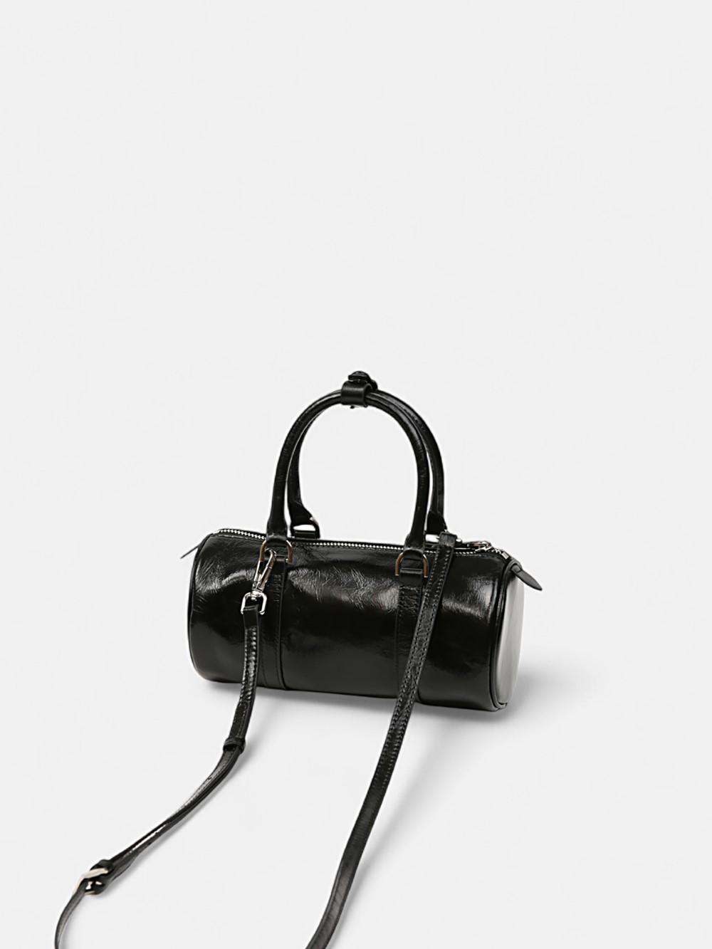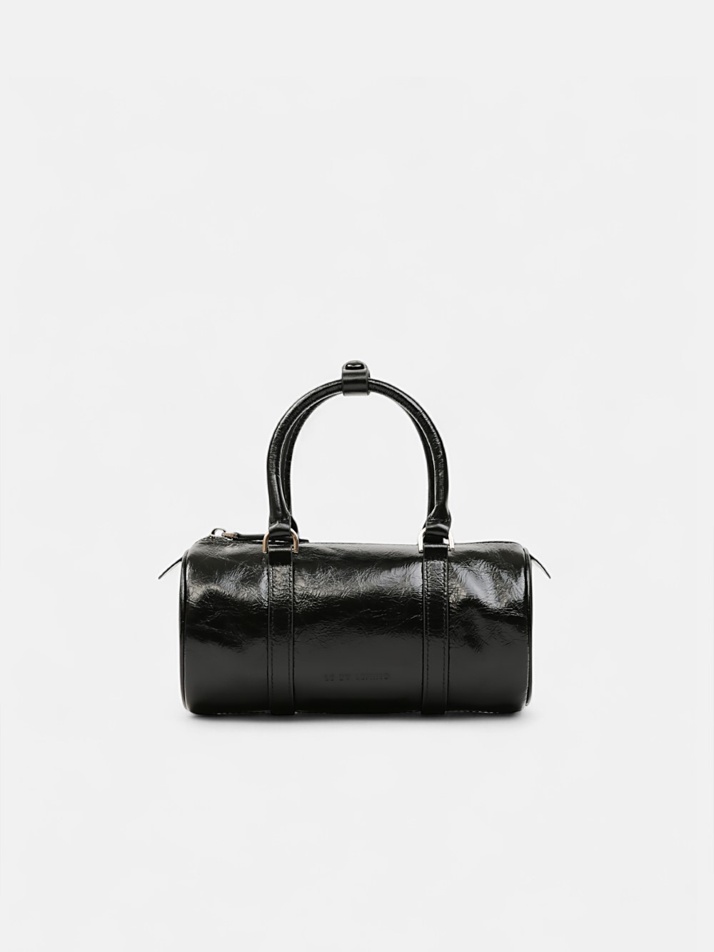 Mini barrel bag ánh kim LE BY LEMINO – phom trụ giữ dáng, khóa kéo an toàn, dây đeo tháo rời linh hoạt; nhỏ gọn nhưng đủ chỗ cho vật dụng mỗi ngày