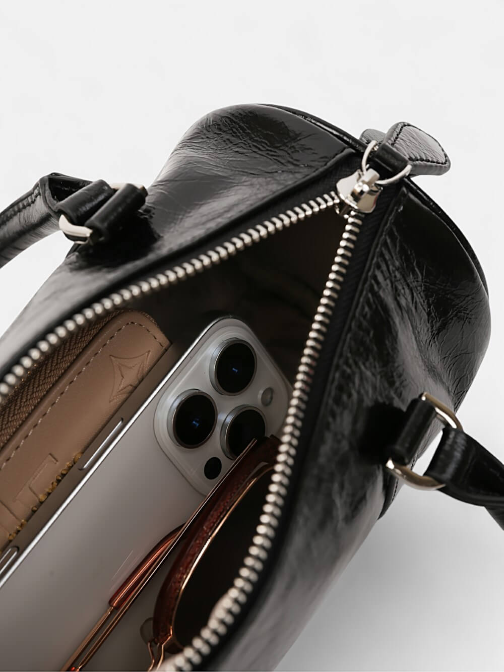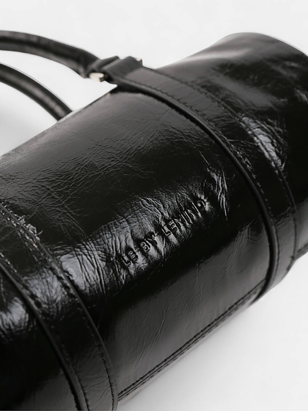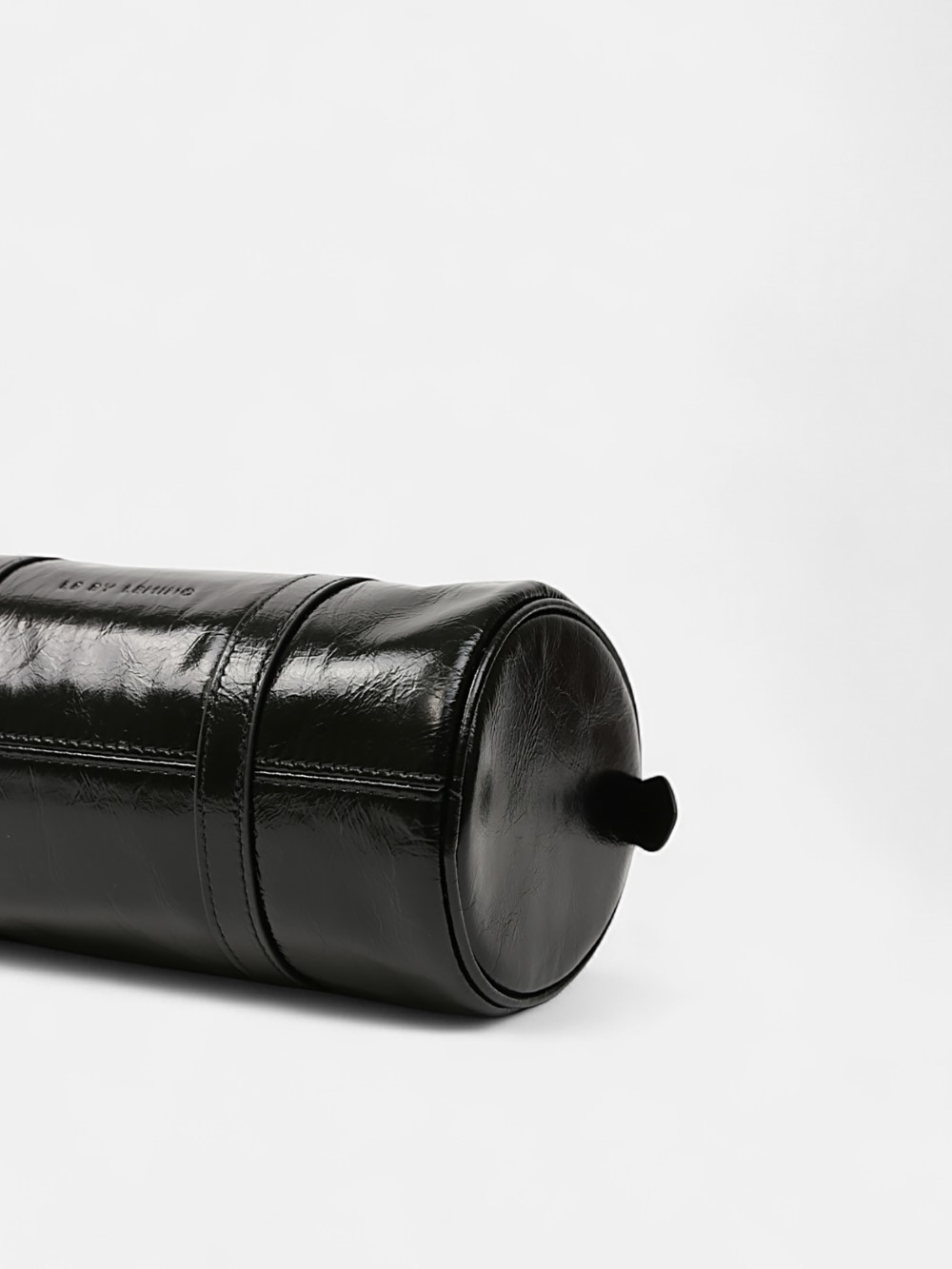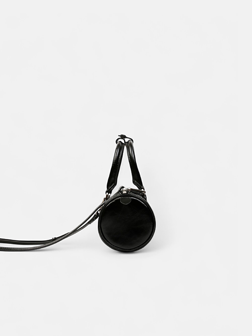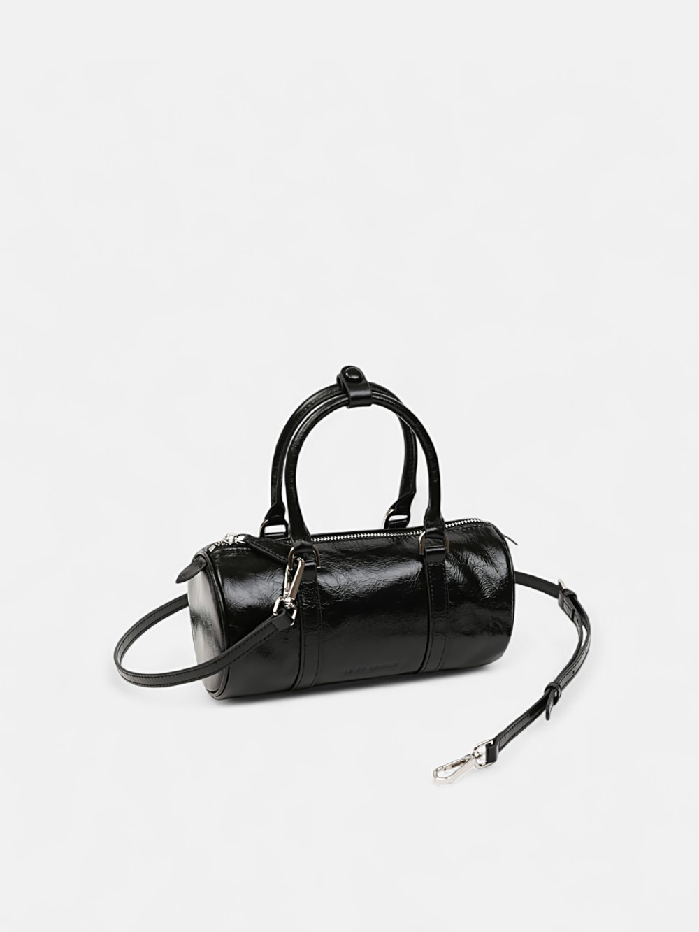 Mini barrel bag ánh kim LE BY LEMINO – phom trụ giữ dáng, khóa kéo an toàn, dây đeo tháo rời linh hoạt; nhỏ gọn nhưng đủ chỗ cho vật dụng mỗi ngày